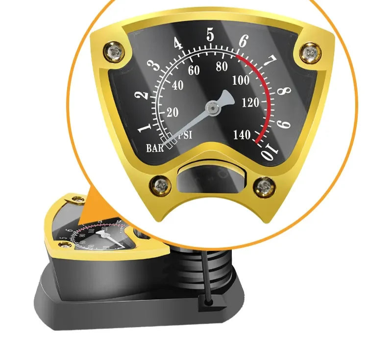 Controla la presión exacta con su medidor incorporado y evita sobreinflar tus llantas. Precisión y seguridad en cada uso.