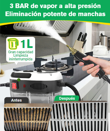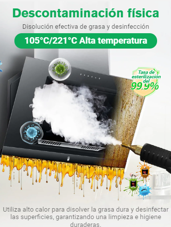 El vapor a alta temperatura desinfecta superficies sin químicos, ideal para hogares con niños o mascotas.